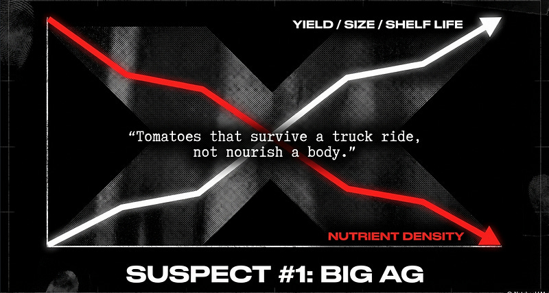 Since the Green Revolution, the game has been bigger, faster, cheaper. Breed crops for size, pest resistance, and shelf life — not nutrition. Tomatoes that survive a cross-country truck ride, not nourish a human body. Donald Davis, the lead researcher on the 2004 study, nailed it: “Efforts to breed new varieties of crops that provide greater yield, pest resistance, and climate adaptability have allowed crops to grow bigger and more rapidly, but their ability to manufacture or uptake nutrients has not kept pace with their rapid growth.” We’ve turned food into a commodity. Nutrients were the first casualty.