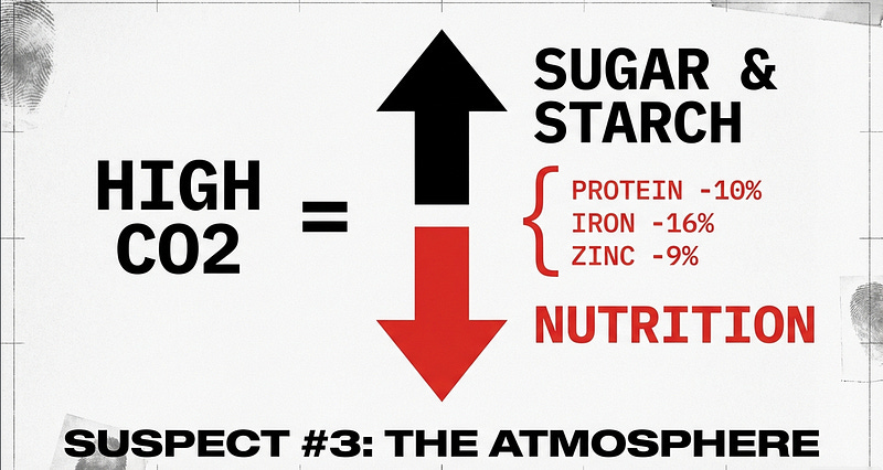 But the real kicker? Climate change. Rising CO2 levels don’t just warm the planet — they actively sabotage our food. Studies show that elevated CO2 reduces protein in crops by 10%, iron by 16%, and zinc by 9%. Rice and wheat — staples for half the global population — are hit hardest according to this.