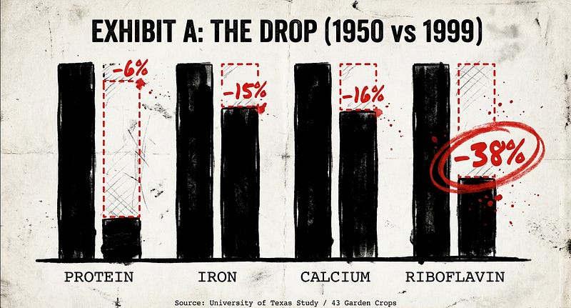 Back in 2004, researchers at the University of Texas dropped a study that should’ve set the world on fire. They dug into USDA nutrient data for 43 garden crops — carrots, spinach, strawberries, the stuff we’re told to eat for health — and compared the numbers from 1950 to 1999.