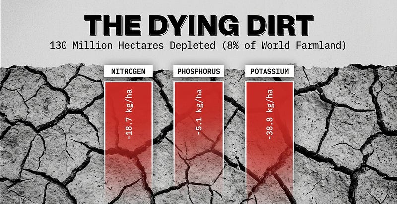 Then there’s soil depletion — the silent, creeping disaster beneath our feet. Globally, soils are losing nutrients at a rate of 18.7 kg of nitrogen, 5.1 kg of phosphorus, and 38.8 kg of potassium per hectare every year. 130 million hectares of cropland — 8% of the world’s farmland — are now nutrient-depleted like this study shows.